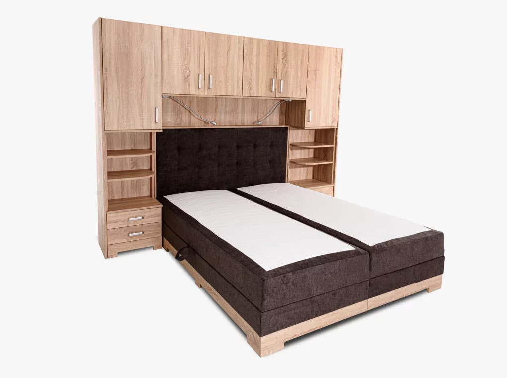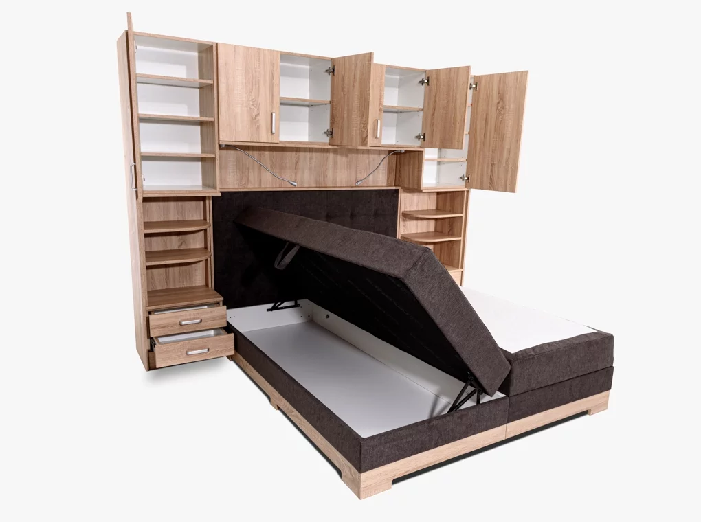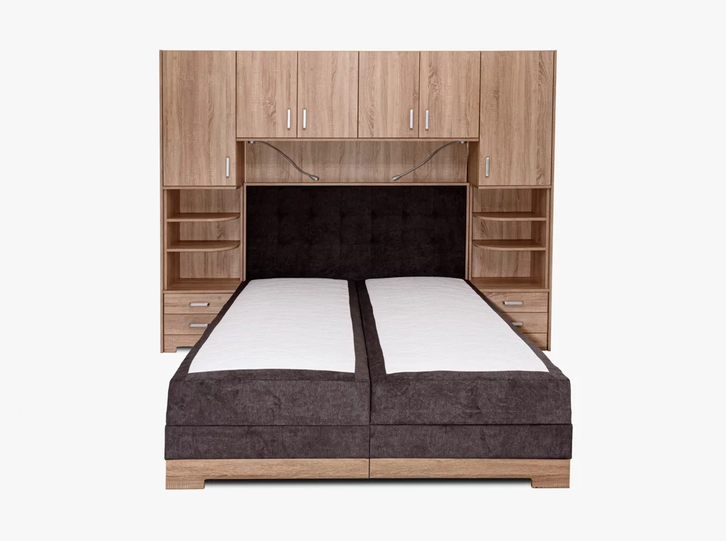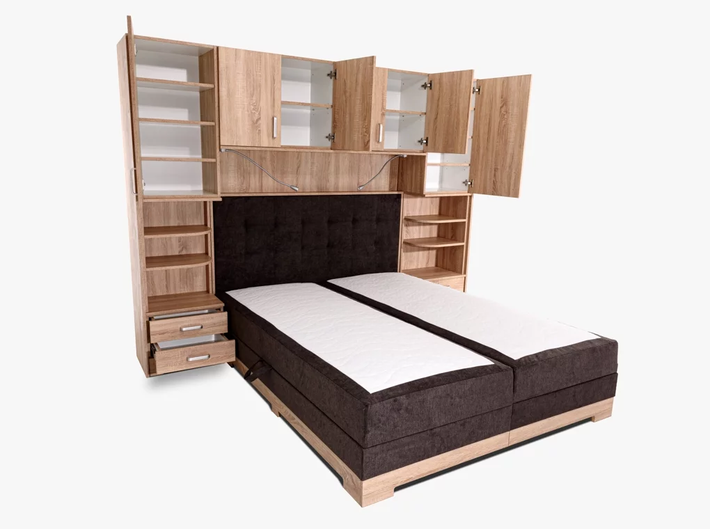 Választható méretű és színű áthidaló szekrény franciaágyhoz. Maximális térkihasználás érdekében az ágyat körbe veszi a szekrény, így esztétikus mégis nagyméretű tároló helyekhez jutunk. Szekrény, éjjeliszekrény, polc, lámpa – minden egyben.