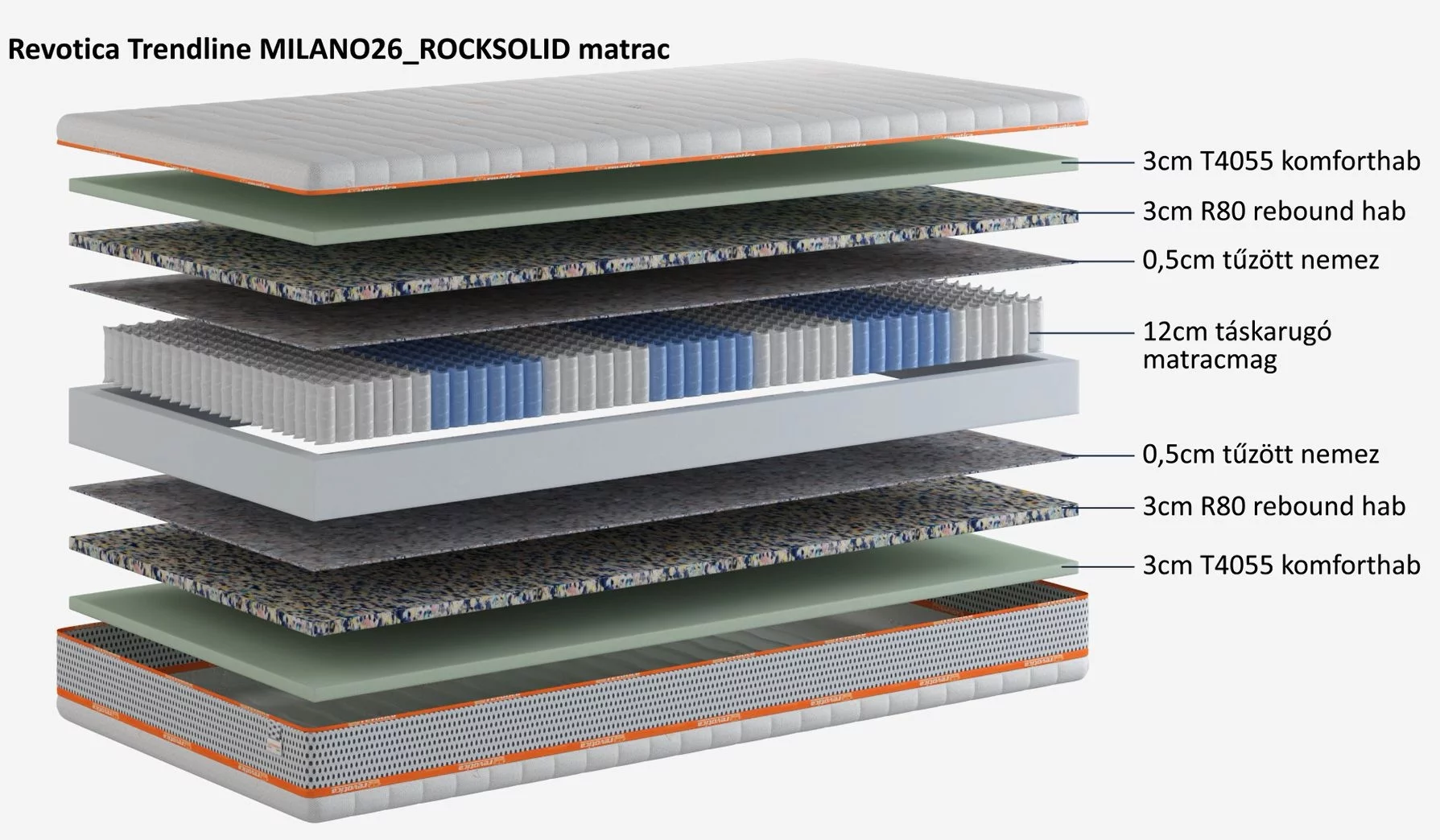 ✔A MILANO26 ROCKSOLID matrac komfortrétegét egy kifejezetten kemény R80-as REBOUND habréteg és egy kemény tónusú T4050-es komforthab réteg összeragasztásával alakítottuk ki.