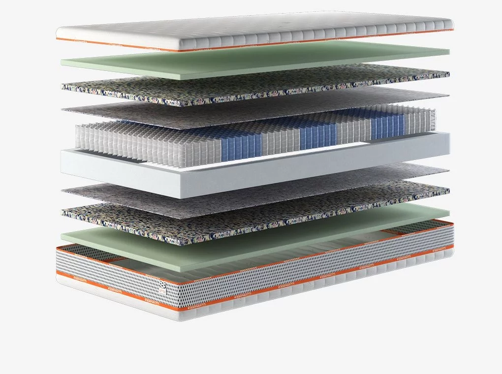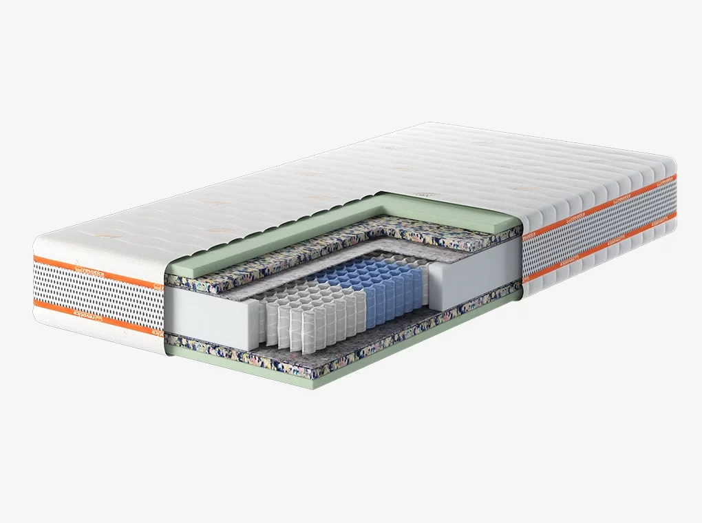 ✔ Különböző keménységű rugótestek alkalmazásával 7 kényelmi zónára osztva. A rugótestet a komfortrétegektől 0.5cm vastagságú, 700 g/nm súlyú tűzött nemez koptatóréteg választja el.